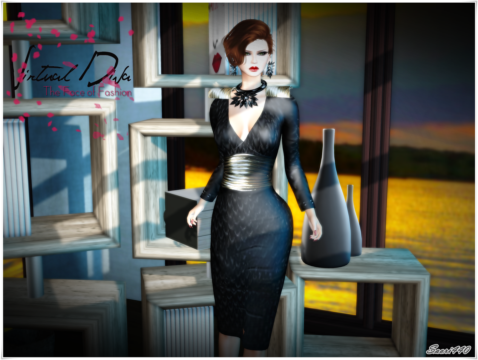 Beautiful black dress with a white gold belt, black jewelry to macth Exlusive for The Instruments